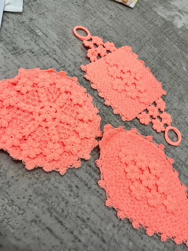 Canlı pembe renkte, çiçek desenli banyo sünger seti. Yuvarlak, saplı dikdörtgen ve yaprak şekilli süngerlerden oluşur.
