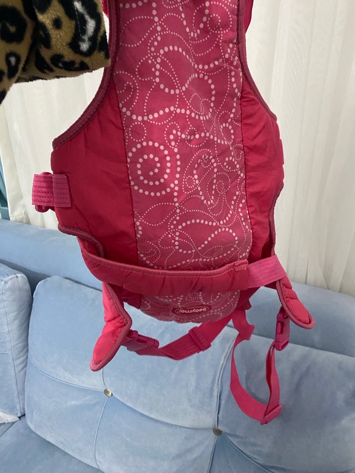 Pembe renkli bebek taşıyıcı, ayarlanabilir kayışları ve yumuşak desenli kumaşı ile rahat taşıma sağlar. Güvenli destek sunar.