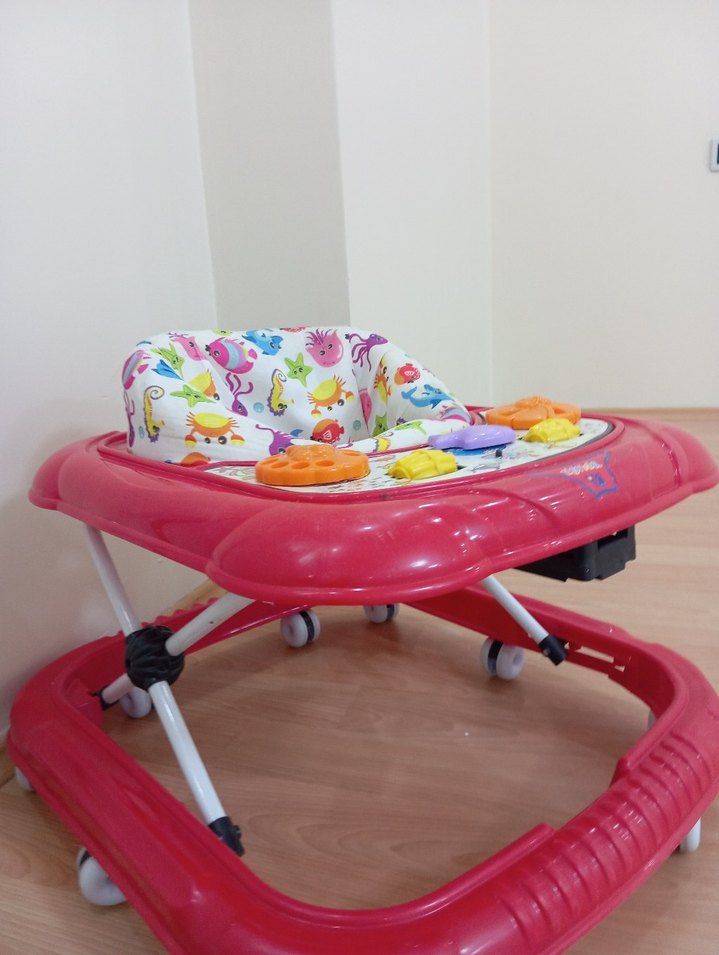 Pembe renkli bebek yürüteci, hayvan desenli renkli oturma alanı ve oyun tepsisi ile erken yürümeyi destekler.