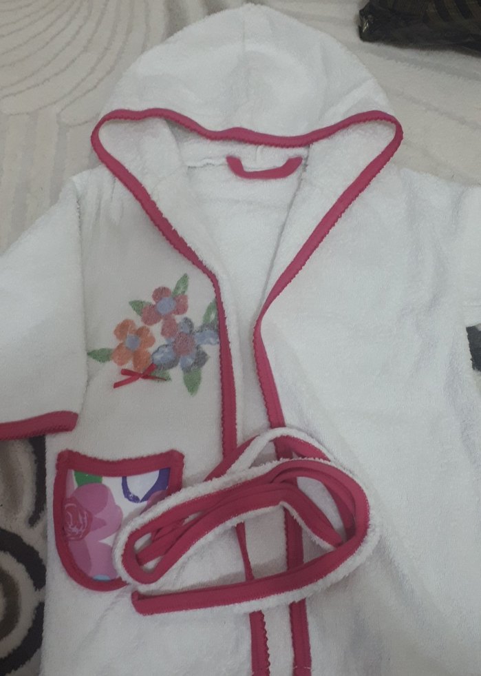 Pembe kenarlıklı ve çiçek desenli, yumuşak kumaştan rengarenk kız çocuk bornoz