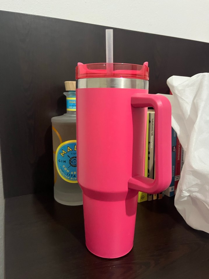 Büyük kulplu ve şeffaf kapaklı bu pembe bardak, renkli içecekler için uygundur.