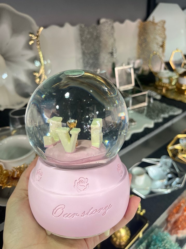 Renkli pembe bir taban üzerinde, içinde harfler bulunan şeffaf cam küre figürin. Tabanında kabartma çiçek ve yazı detayları bulunur.