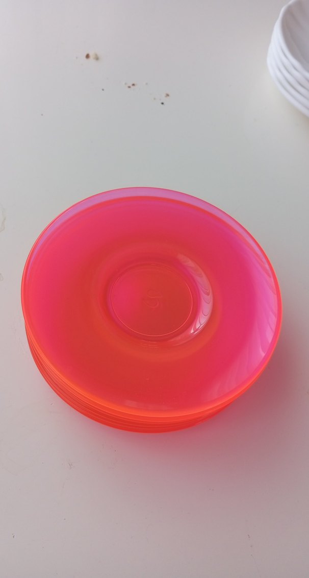 Canlı pembe renkte, desensiz ve kontrakültür tarzında cam tabak. ️