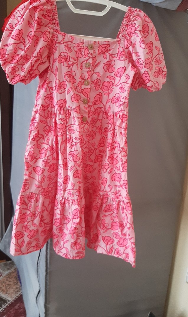 Pembe renkli, çiçek desenli kız çocuk elbisesi, kısa puf kollu ve straplez yakalıdır. Yumuşak sentetik kumaştan, bol kesim ve volan detaylıdır.