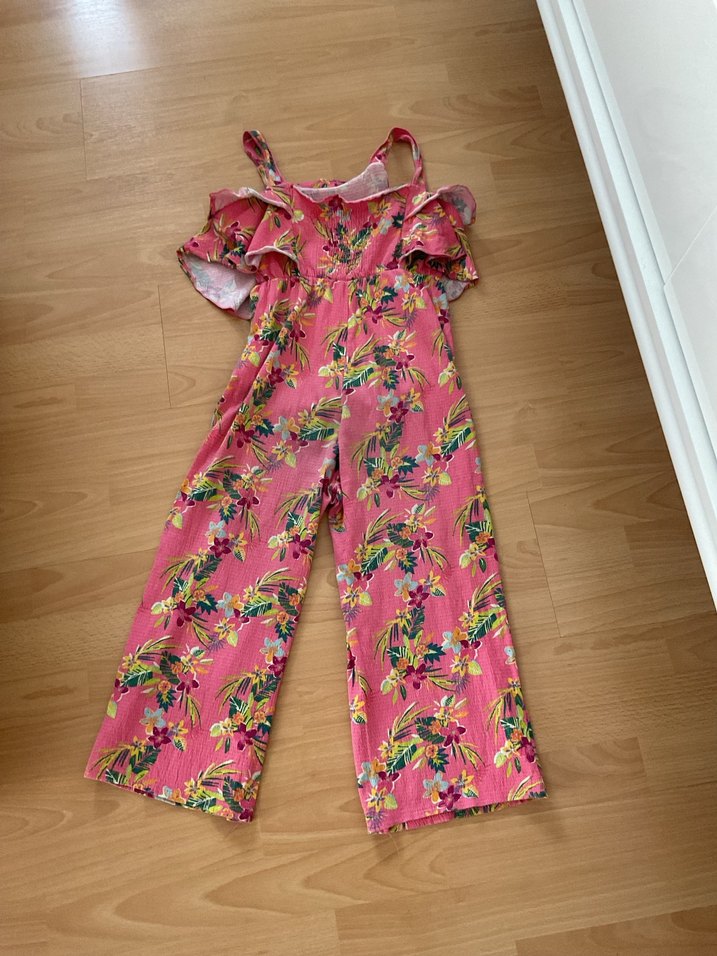 Rahat kesim, pembe renkli çiçek desenli kız tulumu. Askılı ve fırfırlı detaylarla bohem tarz sunar. Koton kumaştan yapılmıştır.