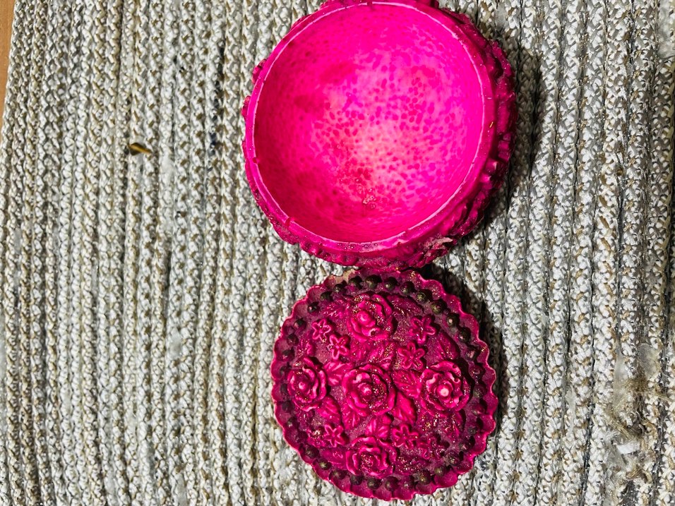 Çiçek desenleri ve renkli detaylara sahip pembe takı kutusu ortama sıcaklık ve şıklık katıyor.