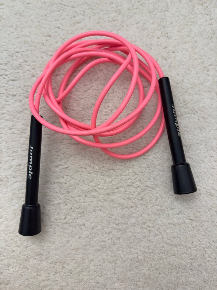Pembe renkli çizgili tasarıma sahip, siyah saplı kolay tutuşlu atlama ipi. ♀️