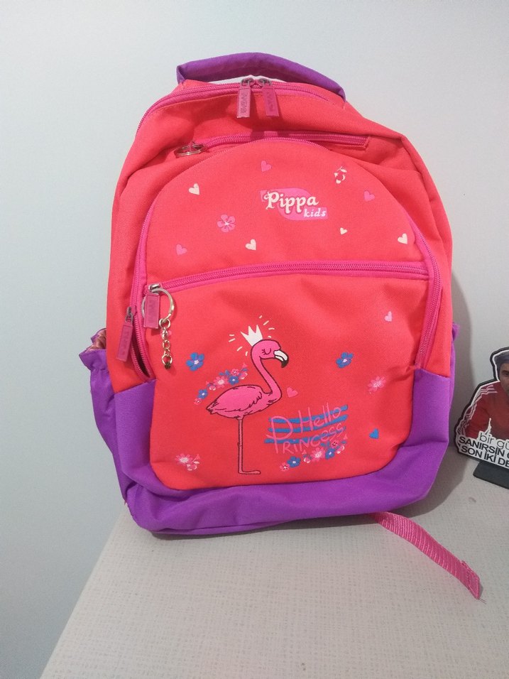 Pembe ve mor renklerde, flamingo desenli çocuk okul çantası. Çoklu fermuarlı bölmeleri, rahat taşıma sapı ve ayarlanabilir askıları bulunur.