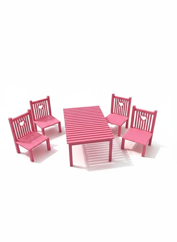 Pembe renkli, kalpli sırt dayanaklı dört sandalye ve ızgaralı masa içeren çocuk oyun mobilyası seti. Oyun zamanı için uygun. Pembe ve Beyaz renk 4 sandalye ve bir masa içindir. Masa: U:12cm G:4.7cm Sandalye: U:6.7cm G:4cm