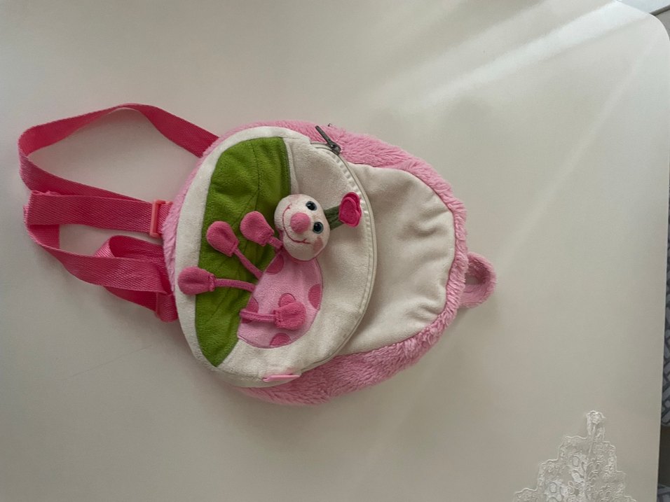 Pembe renkli çocuk sırt çantası, yumuşak dokulu ve önünde sevimli peluş figürlü bir cep bulunur. Ayarlanabilir askıları vardır.