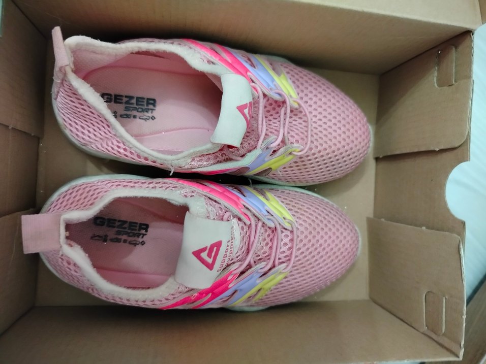 Çocuk spor ayakkabısı, renkli baskılı desenli ve bağcıklı, hava alabilen kauçuk malzemeden, dolgu topuklu tasarıma sahip.