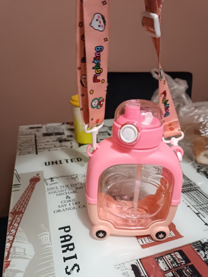Renkli pembe çocuk termos şişe, taşıma askısı ve şeffaf bölmesi ile kullanışlıdır. Üzerinde 'PARIS' yazısı bulunur.sorunsuz #suluk #termos #kırtasiye #malzemeleri #tabak #bardak #kaşık #çatal #