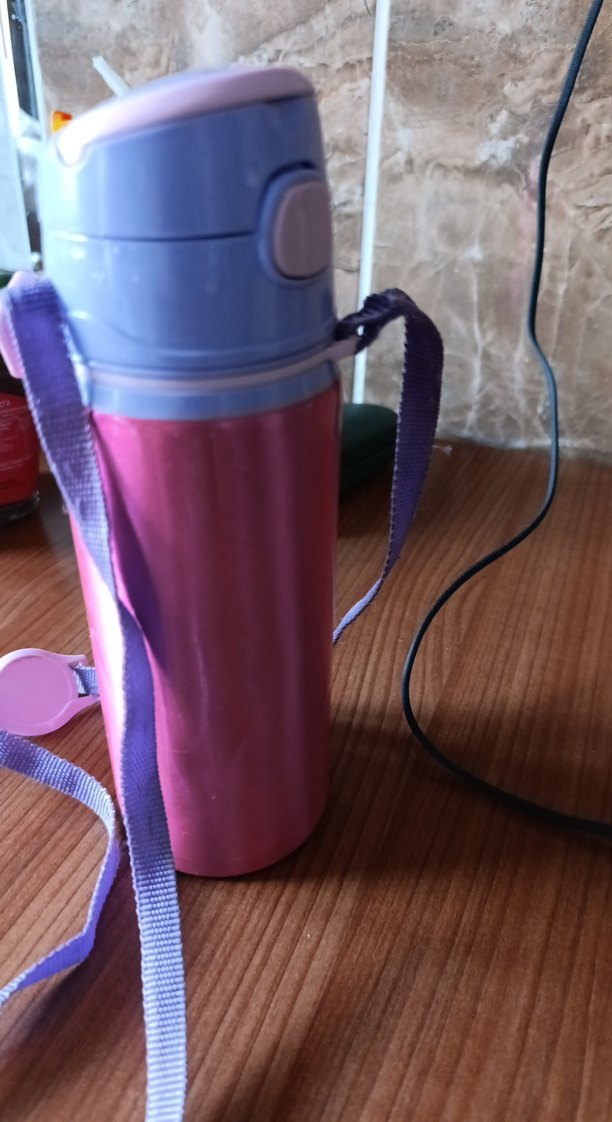 Pembe renkli çocuk termos şişesi, kolay taşıma için mor askıya sahiptir. Sıcak veya soğuk içecekleri uzun süre muhafaza eder. bir dönem kullanılmıştır, çok sembolik bir fiyattan satiyorum