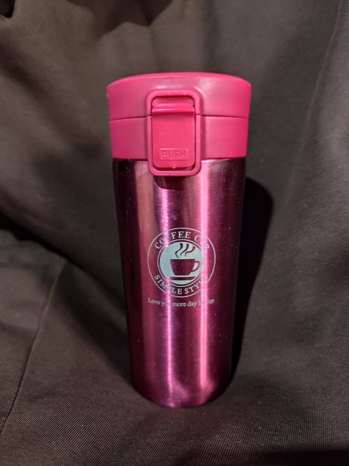 içindeki içecgi uzun süreli sıcak tutar kapak kısmı kilitkenir şekilde ayarlanir asla dökülme yapmaz Canlı pembe renkte, itmeli kilit kapağa sahip çocuk termos şişesi. Önünde kahve fincanı deseni bulunur. ☕