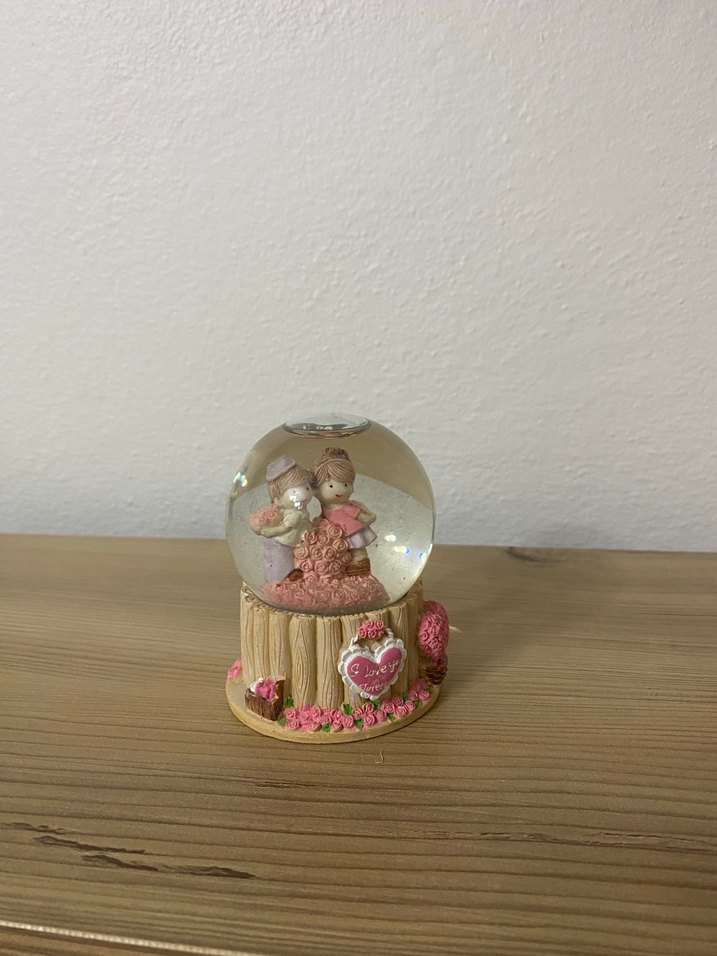 İçinde figür bulunan renkli pembe dekoratif kar küresi. Ahşap tabanı pembe çiçek detayları ve kalp süslemeleriyle tamamlanmıştır. ❄️