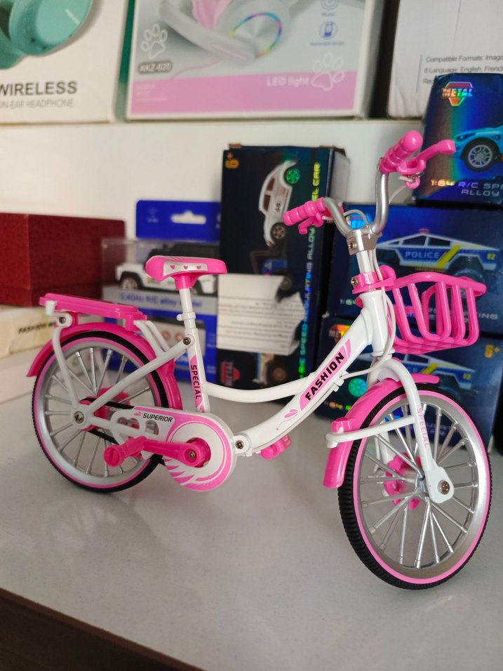 Pembe renkli, ön sepetli ve sağlam metal alaşım bisiklet. Gövdesinde 'FASHION' yazısı bulunur. kauçuk tekerler pedalla döner 1/8 ölçek 20x13cm