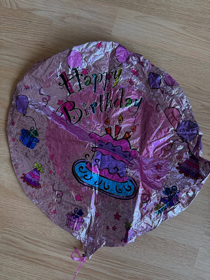 Pastel pembe renkte, üzerinde doğum günü pastası, hediyeler ve parti şapkaları bulunan renkli doğum günü balonu.