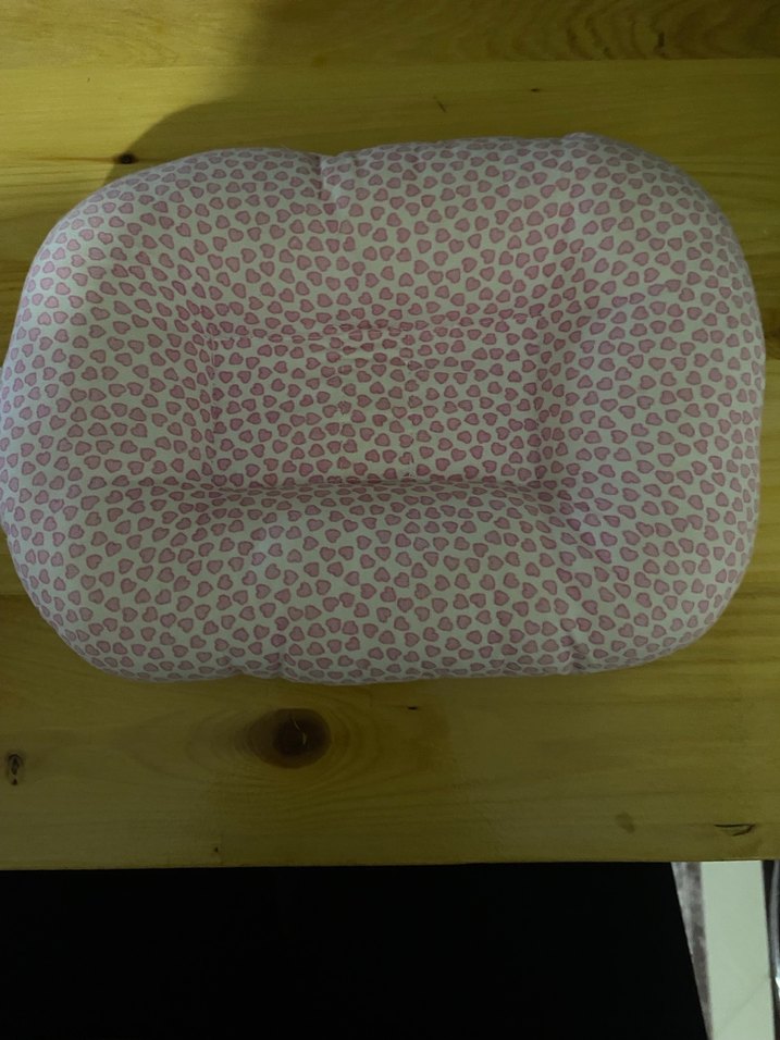 Yumuşak kumaş kaplı, pembe renkli emzirme yastığı. Konfor ve destek sağlar.