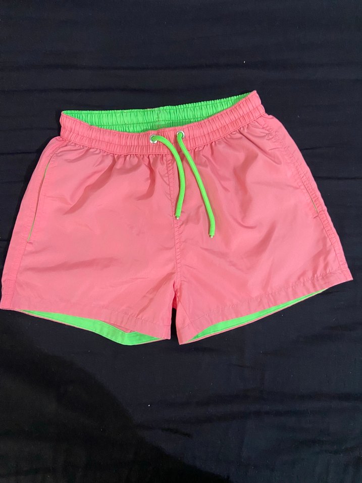 Rahat kesim, pembe renkli erkek mini yüzücü şortu; iç kısmı ve bağcığı yeşil detaylı, desen içermeyen sade tasarım.