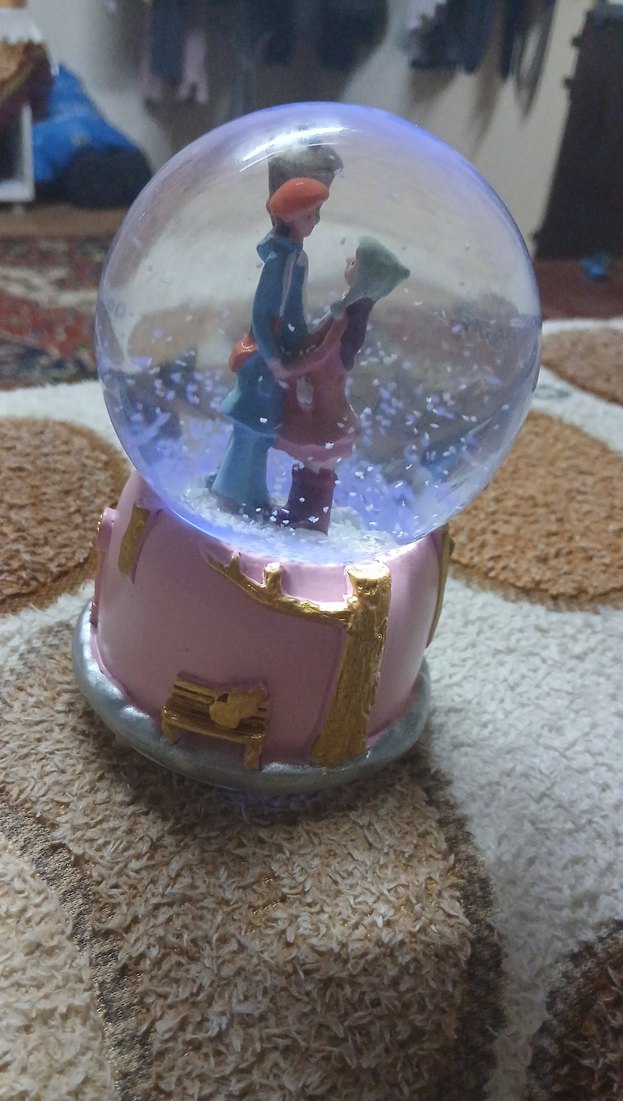 Pembe renkli taban üzerinde, içinde çift figürü bulunan ve kar taneleriyle çevrili kar küresi. ❄️ yeni alındı müzükli