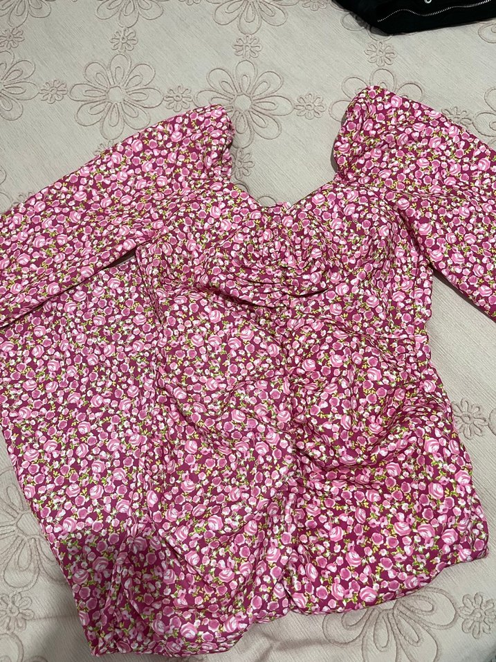 Pembe renkte, fırfırlı detaylı, kısa kollu, salaş kesim kadın bluz. Bohem tarzıyla uyumlu, baskılı desene sahip.