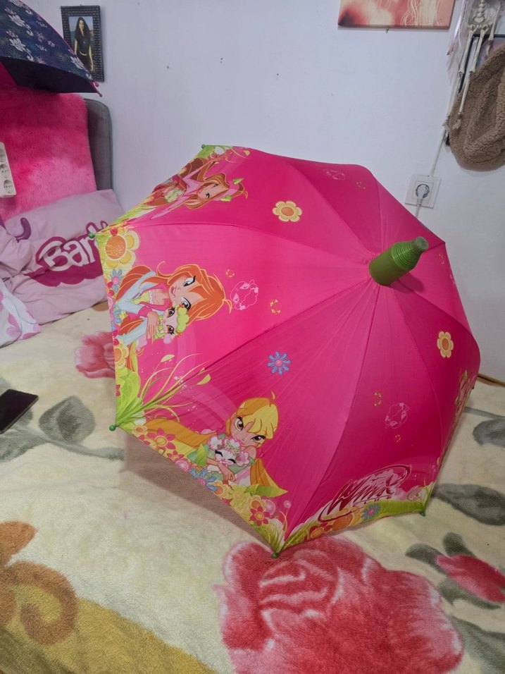 Pembe renkte, fırfırlı ve pop kültür temalı desenlere sahip kadın şemsiyesi, sade bir stile ışıltılı bir dokunuş katıyor.