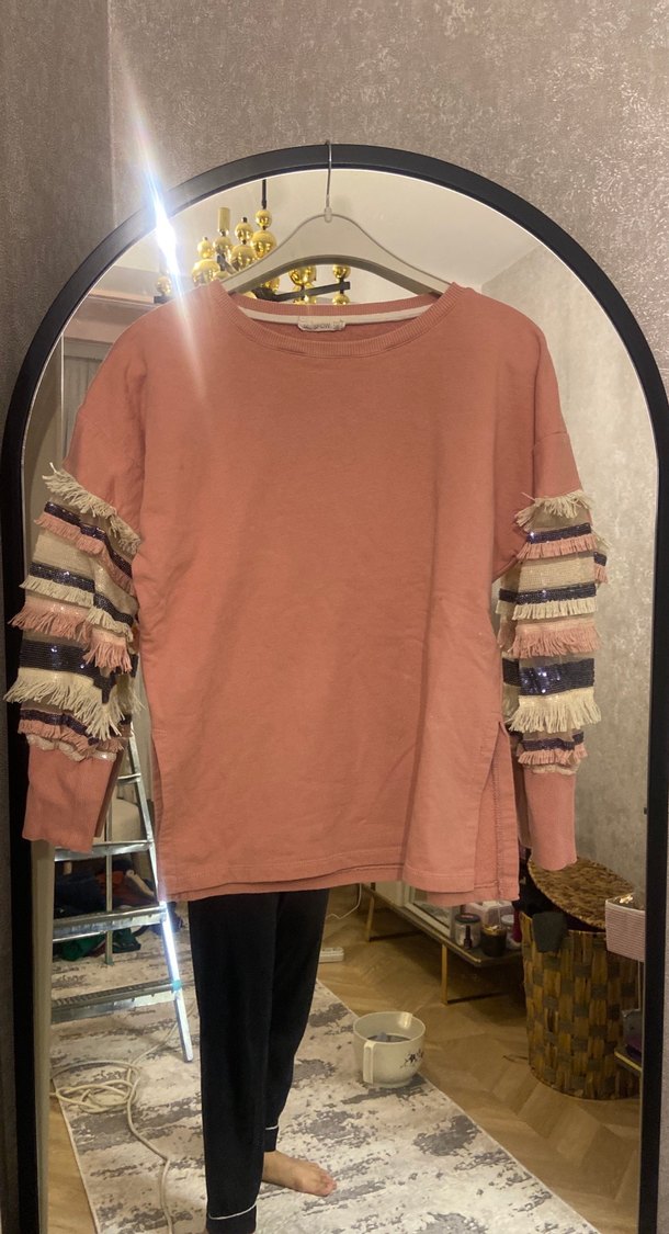 Pembe pastel renkli tekstil kumaştan, uzun kollu, yuvarlak yakalı, bol kesim kadın sweatshirt. Kollarda fırfır detayları bulunur.