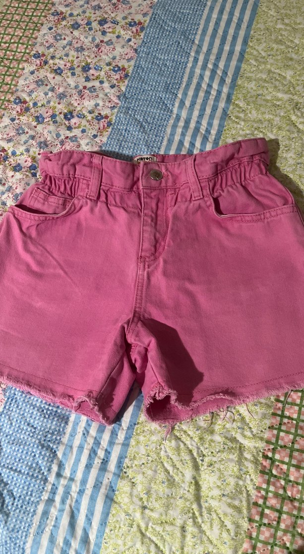 Pembe renkte, bel kısmında fırfırlı detaylı, bol kesim denim şort. Pastel tonlarda ve hafif yıpranmış kenarlarıyla retro tarzı yansıtıyor.