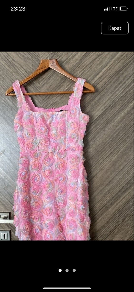 Pembe pastel tonlarda, fırfır detaylı ve kolsuz, vücuda oturan midi boy elbisedir. Vintage parti tarzına uygundur.