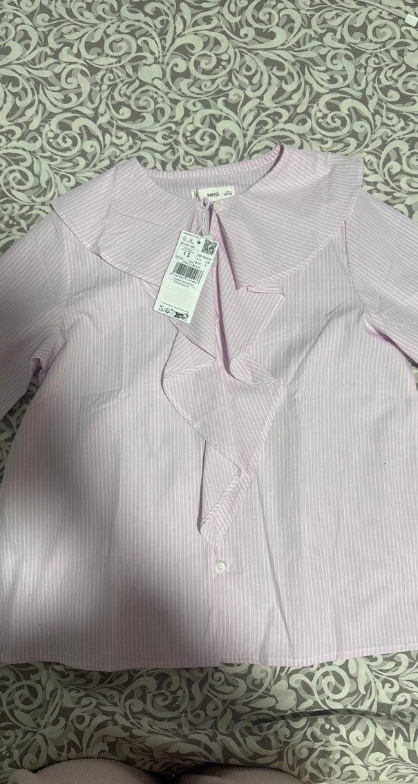 Pembe pastel renkli, uzun kollu ve yakalı gömlek. Fırfır detaylı, bol kesim ve baskılı desene sahip, sentetik kumaştan üretilmiştir.