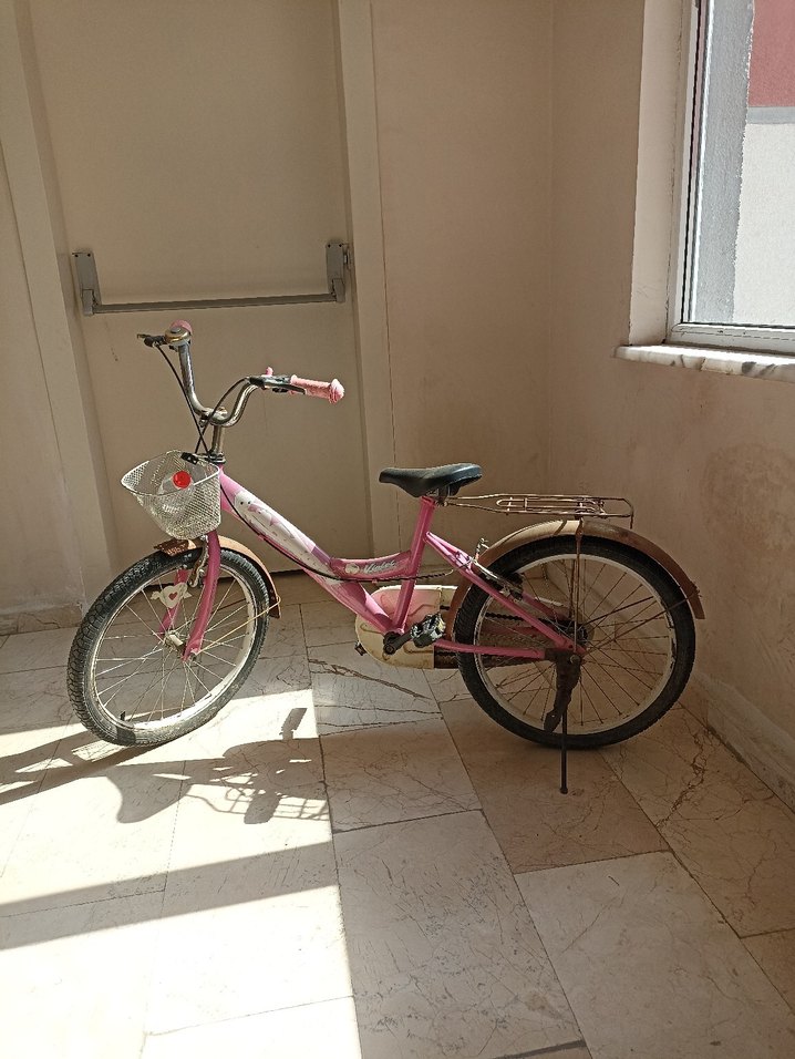 Renkli pembe iki tekerlekli bisiklet, ön sepet ve arka taşıyıcıya sahiptir. Rahat sele ve sağlam lastiklerle dengelidir. lastik üstleri küflenmiş . onun dışında sağlamdır. yer Ankara. 10 yaşa kadr binilenilşr