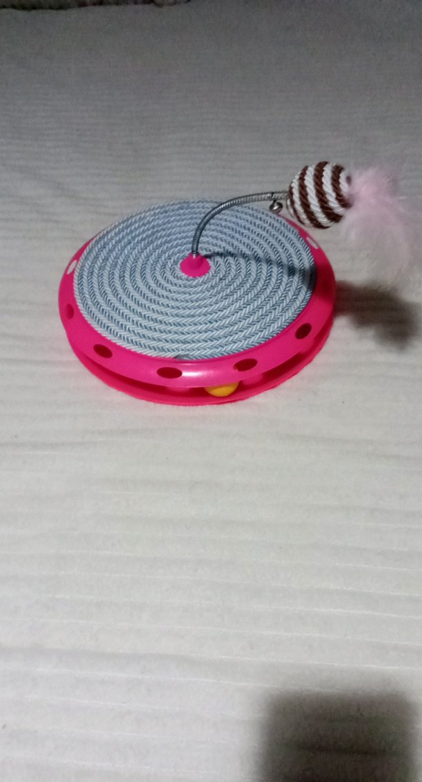 Pembe renkli yuvarlak tırmalama yüzeyine sahip, çizgili top ve tüyle süslenmiş renkli kedi oyuncağı .