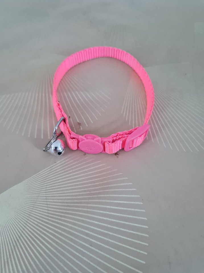 Ayarlanabilir bant ve küçük zil içeren renkli pembe kedi tasması.