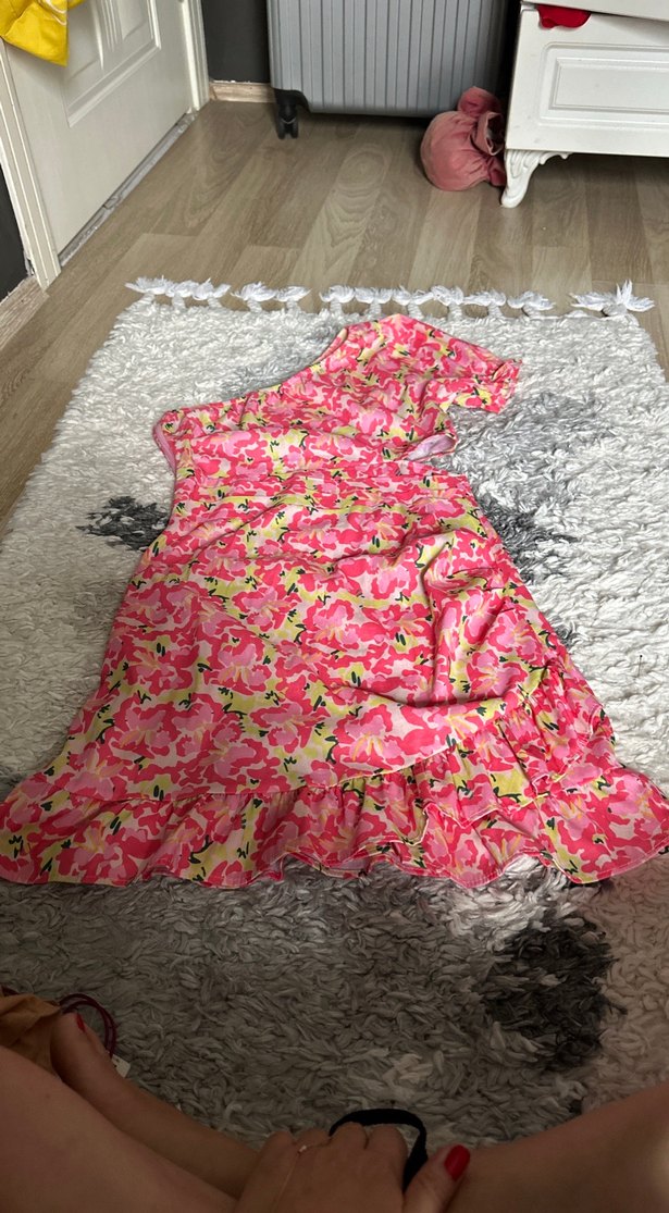 Pembe renkli çiçekli desenli, mini ve tek omuz kesim kadın elbisesi, volan detaylarıyla bohem tarzda, dış mekan kullanımı için uygundur.