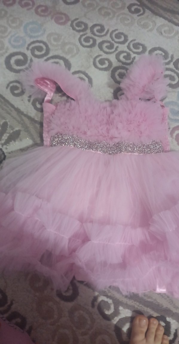 Pembe renkli, askısız, kolsuz, vücuda oturan, fırfırlı ve nakış işlemeli kız çocuk elbisesi, yumuşak sentetik kumaştan.