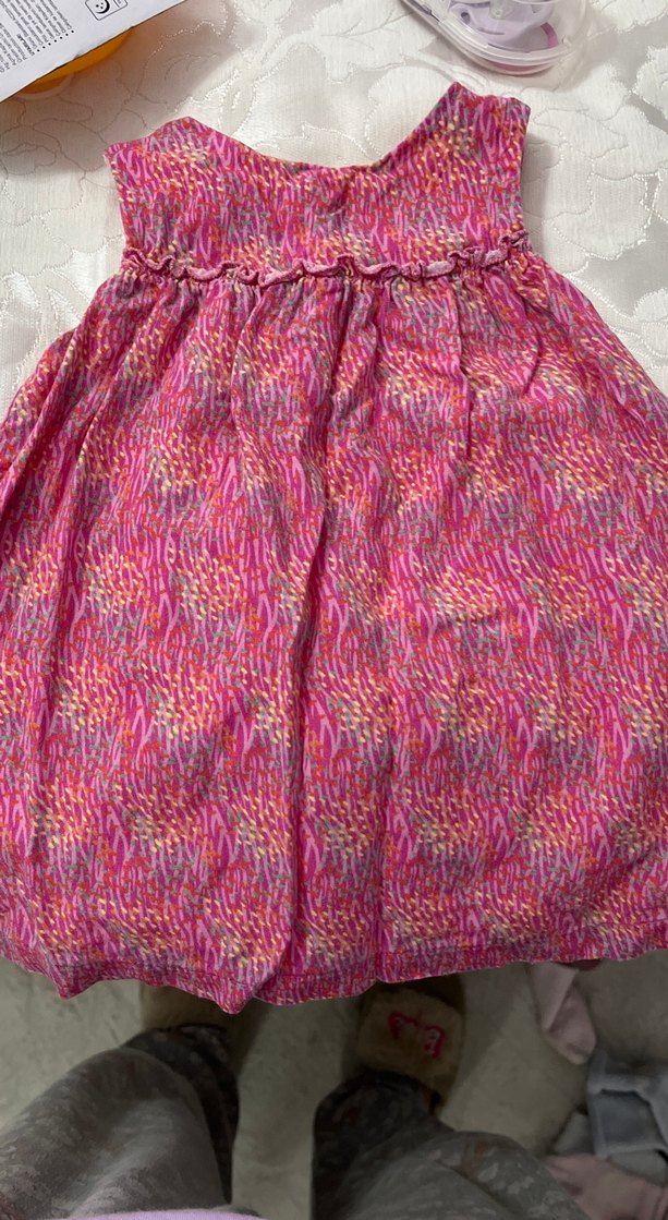 Pembe renkli, fırfırlı ve renkli batik desenli kız çocuk elbisesi. Yumuşak sentetik kumaştan, salaş kesim ve tekne yaka ile bohem tarzda.