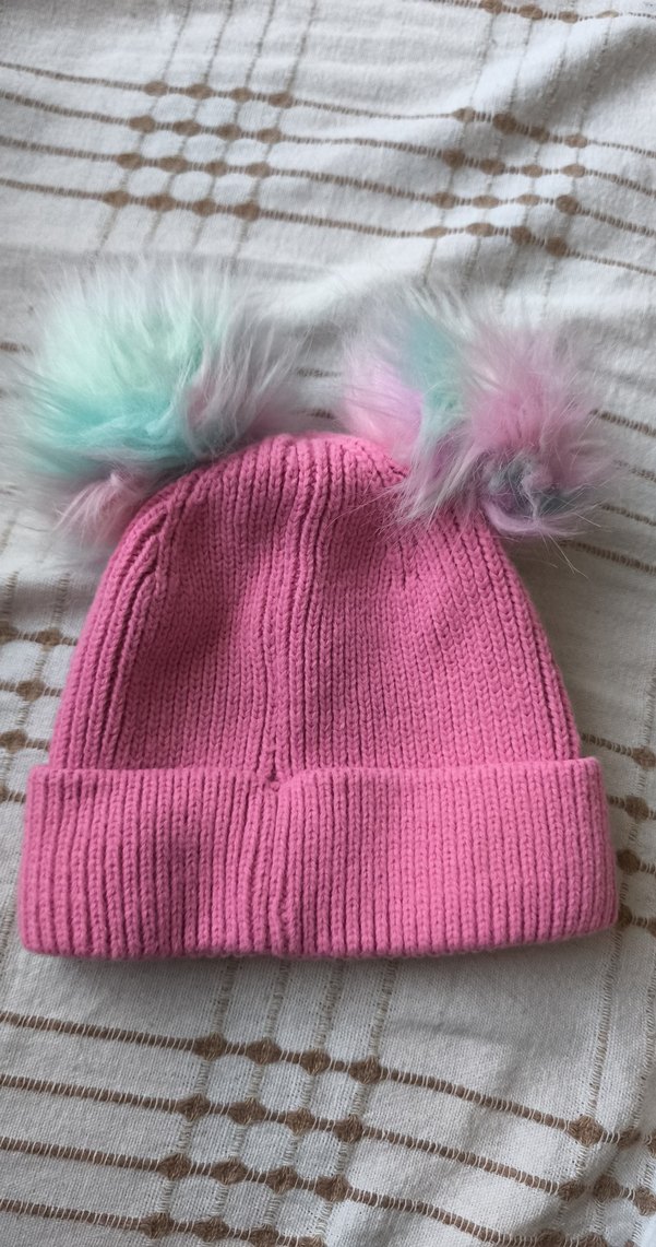 Çocuklar için yumuşak, pastel tonlarda pembe örgü bere, üzerinde iki pastel tonlu tie-dye ponpon bulunur.