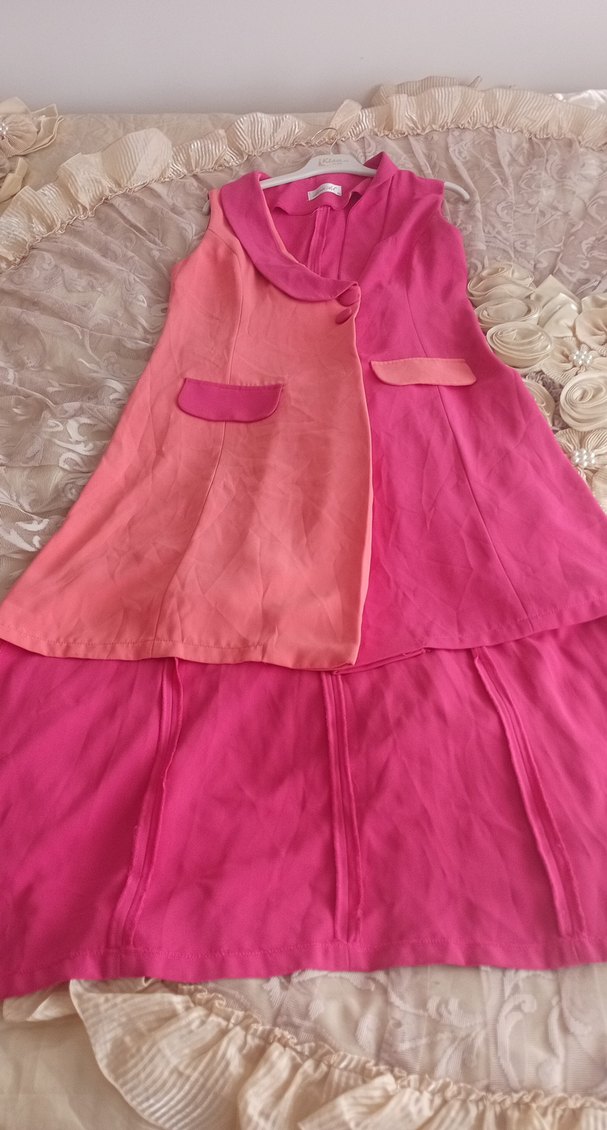 Kolsuz, bol kesim ve ipeksi dokulu pembe elbise, fırfır detaylı ve askısız yakalı bohem tarzında.
