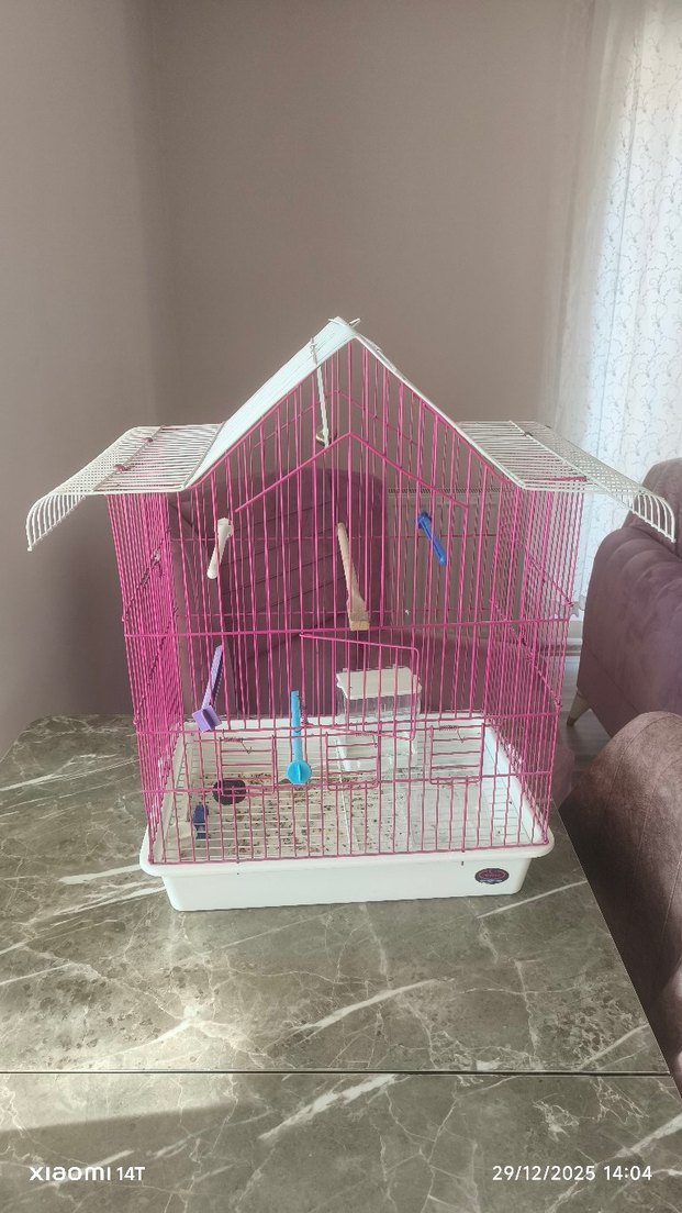 Pembe renkli, beyaz tabanlı kuş kafesi, içinde çeşitli tünekler ve aksesuarlar bulunur. (papağan içinde uygundur.