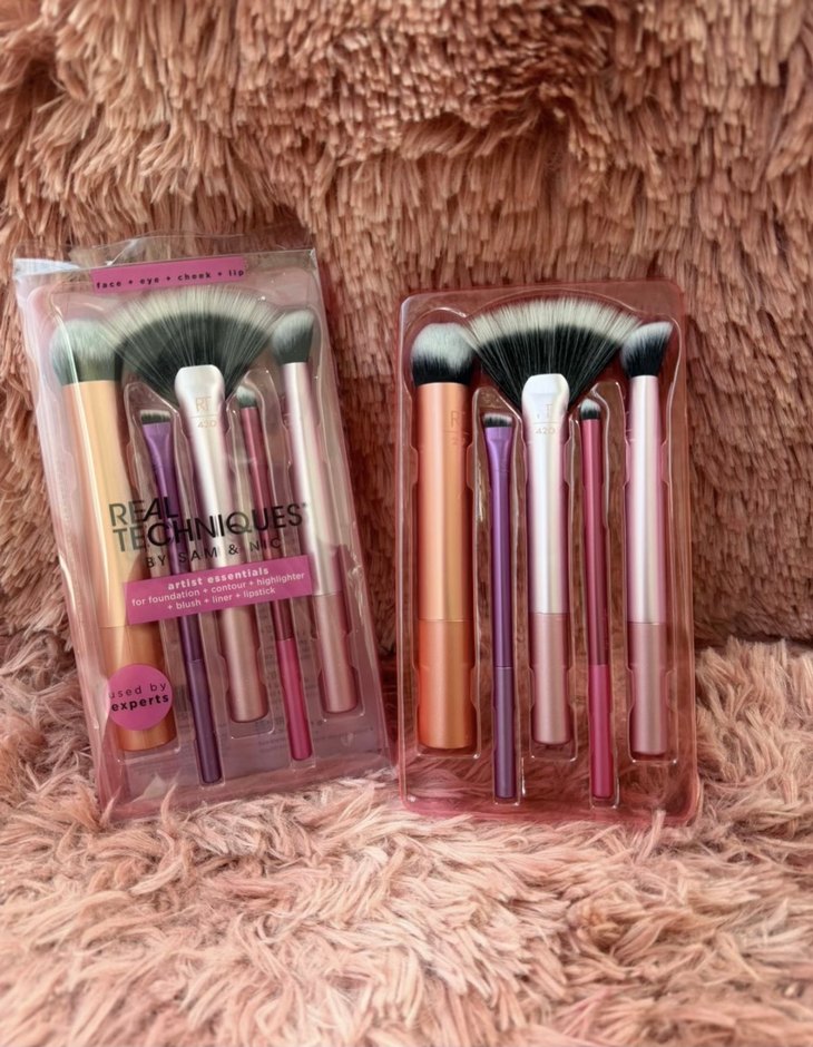 Yumuşak kıllara ve ergonomik saplara sahip, çeşitli makyaj uygulamaları için pembemsi açık renkte makyaj fırçaları seti.