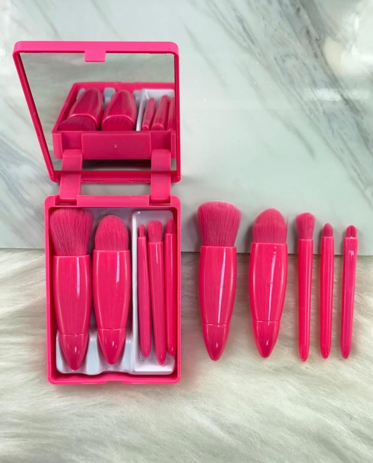 Yumuşak kıllı, çeşitli boylarda pembe makyaj fırçalarından oluşan set, aynalı kompakt kutuda sunulmuştur.