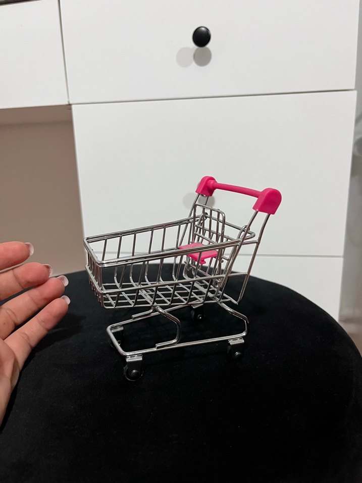 Pembe kulplu, metal sepetli renkli mini alışveriş arabası