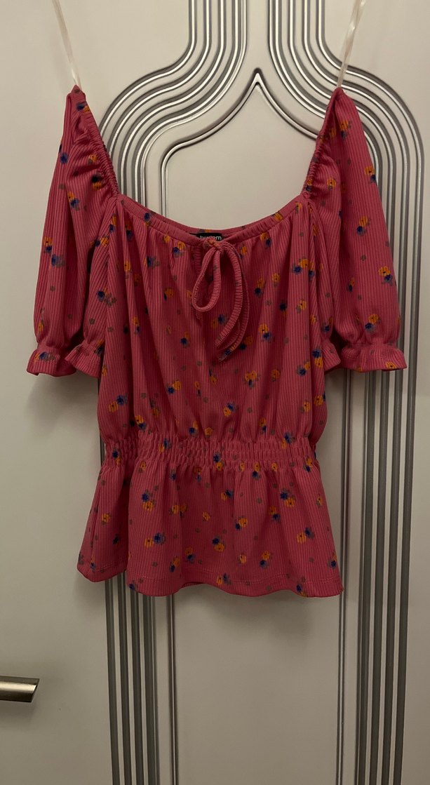Renkli tie-dye desenli, kısa kollu, straplez ve bol kesim pembe bluz, fırfır detaylı, günlük kullanıma uygun.