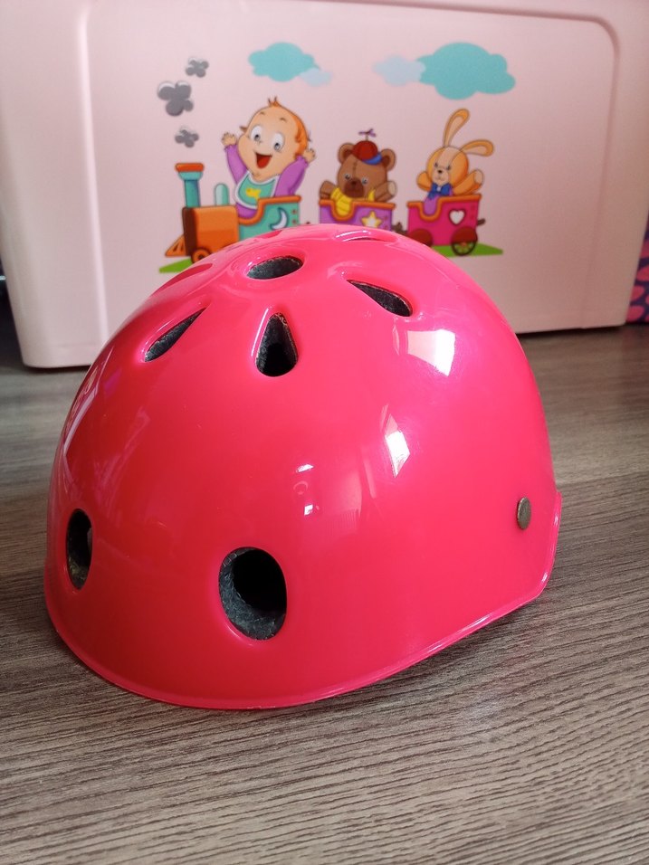 Pembe renkli motosiklet kaskı, havalandırma delikleri ve Velcro bant ile güvenli kullanım sağlar. Düz, sade tasarımı vardır. ️