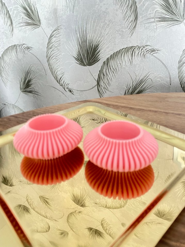 İki adet pembe renkli, kabartmalı dokulu mumluk seti. Yansıtıcı bir yüzeyde duruyor ve dekoratif bir görünüm sağlıyor. ️