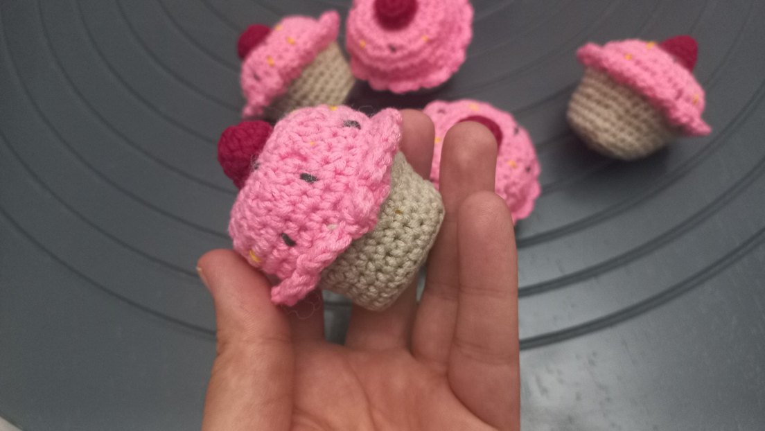 Pembe ve renkli detaylara sahip, cupcake şeklinde yumuşak örgü anahtarlik