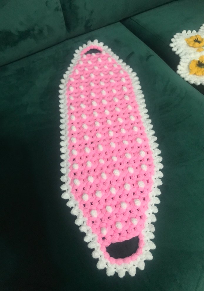 Pembe ve beyaz renklerde, her iki ucunda tutma yerleri olan örgü banyo lifi, nazikçe peeling yapar.