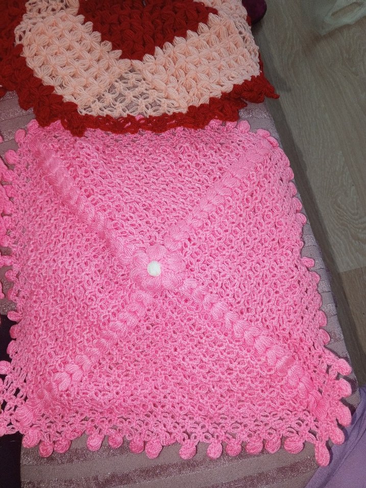 Renkli pembe örgü dokulu, yumuşak ve dekoratif tasarıma sahip el yapımı banyo Lifi.
