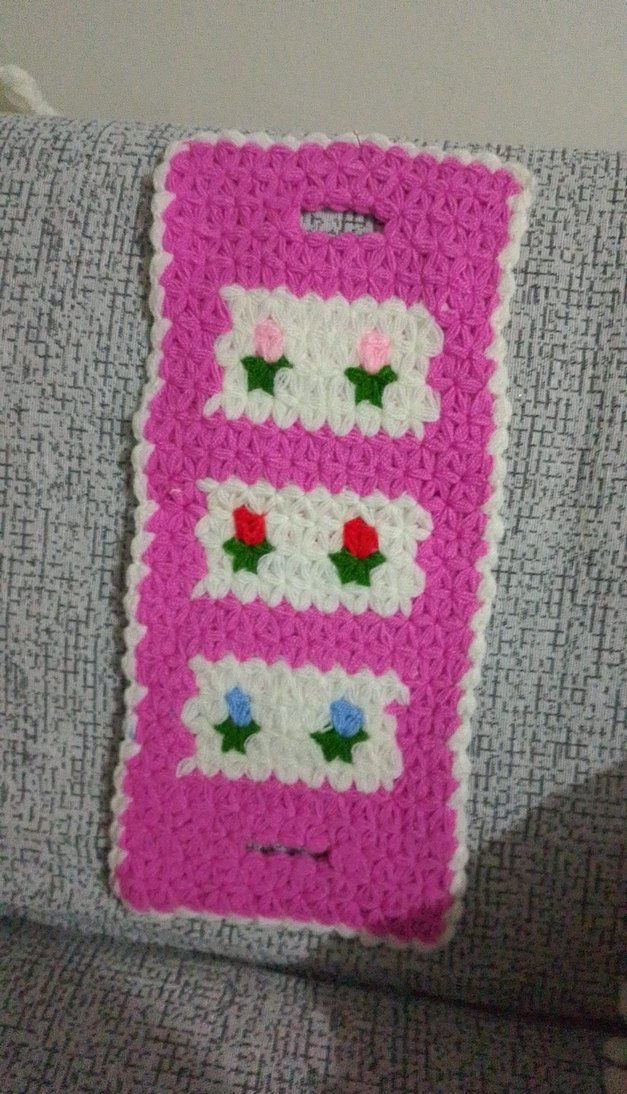 Pembe renkli, üç beyaz panelli, küçük çiçek desenli örgü banyo süngeri. Kullanımı kolay saplı.