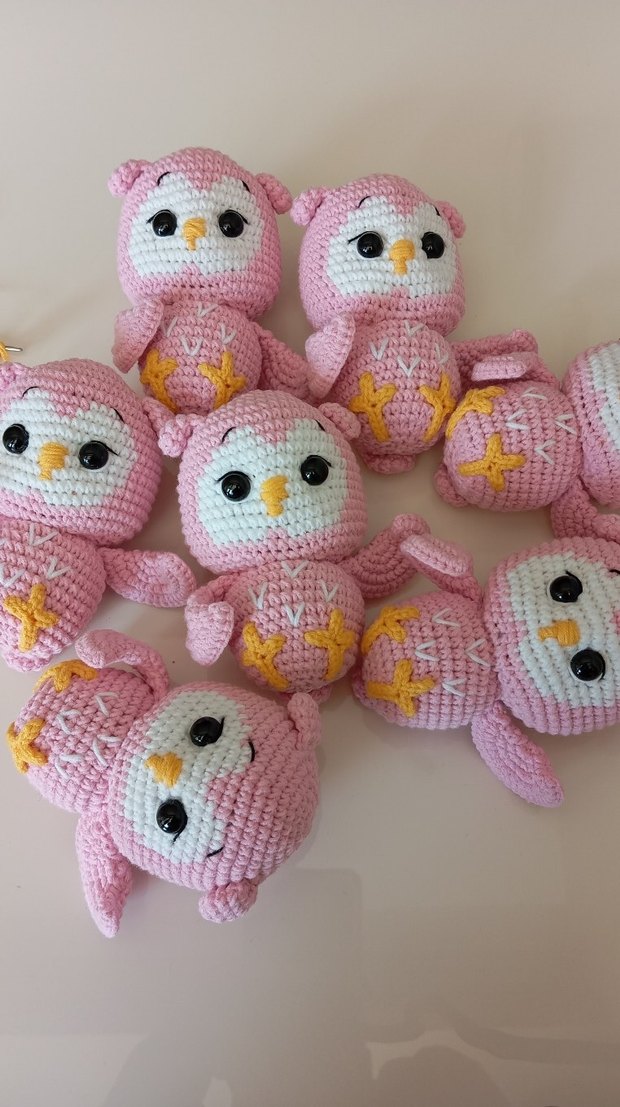 Yumuşak ve renkli pembe örgü baykuş peluş oyuncaklar, büyük siyah gözler ve sarı ayaklarla. Sevimli ve el yapımı detaylar.
